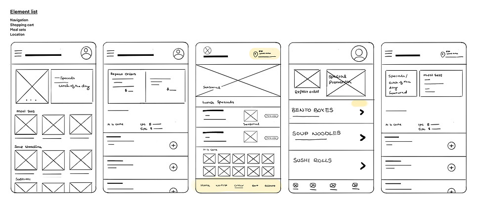 After sketching several designs on paper, we settled on clear titles marking the differing types of food offered at the restaurant. We focused on making the user clear of each step of the user journey by having the user confirm each step.